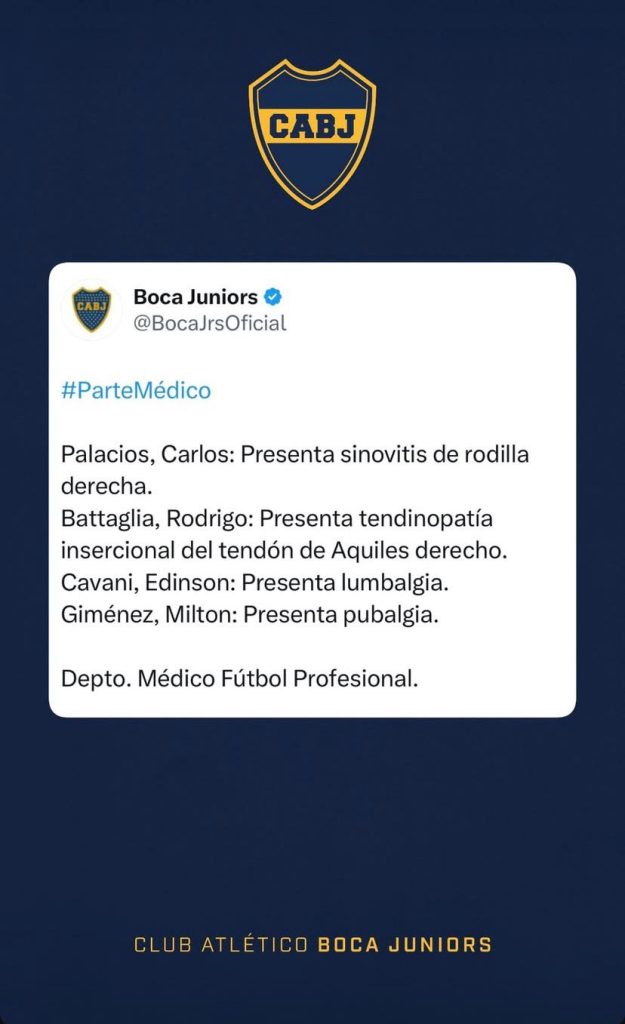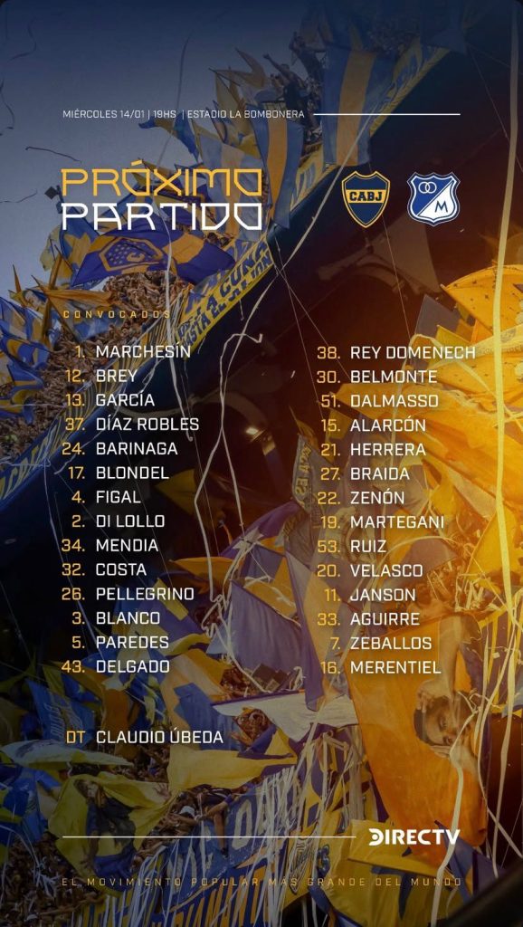 En las últimas horas, el club de la Ribera confirmó que los jugadores Edinson Cavani, Carlos Palacios, Milton Giménez y Rodrigo Battaglia no jugarán el partido frente al elenco colombiano debido a diferentes lesiones. Los futbolistas no formaron parte de los convocados para la primera prueba del año, a partir de las 19.