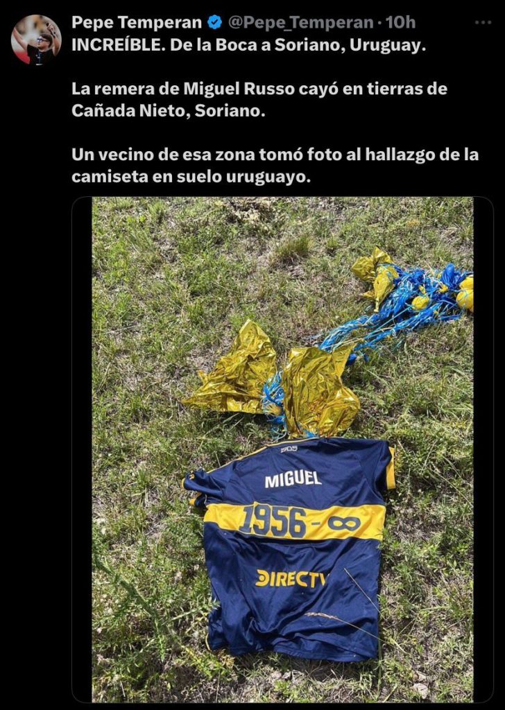 Según relató el periodista uruguayo Pepe Temperan en su cuenta de X, «un joven productor rural de Soriano, trabajando en el campo, se encontró con algo que brillaba: era la camiseta homenaje a Russo que Boca Juniors mandó al cielo en memoria del exentrenador fallecido recientemente».
