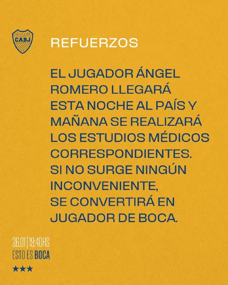 La confirmación fue realizada a través de una publicación en la red social X por una de las cuentas institucionales vinculadas al club. “El jugador Ángel Romero llegará esta noche al país y mañana se realizará los estudios médicos correspondientes. Si no surge ningún inconveniente, se convertirá en jugador de Boca”, informaron.
