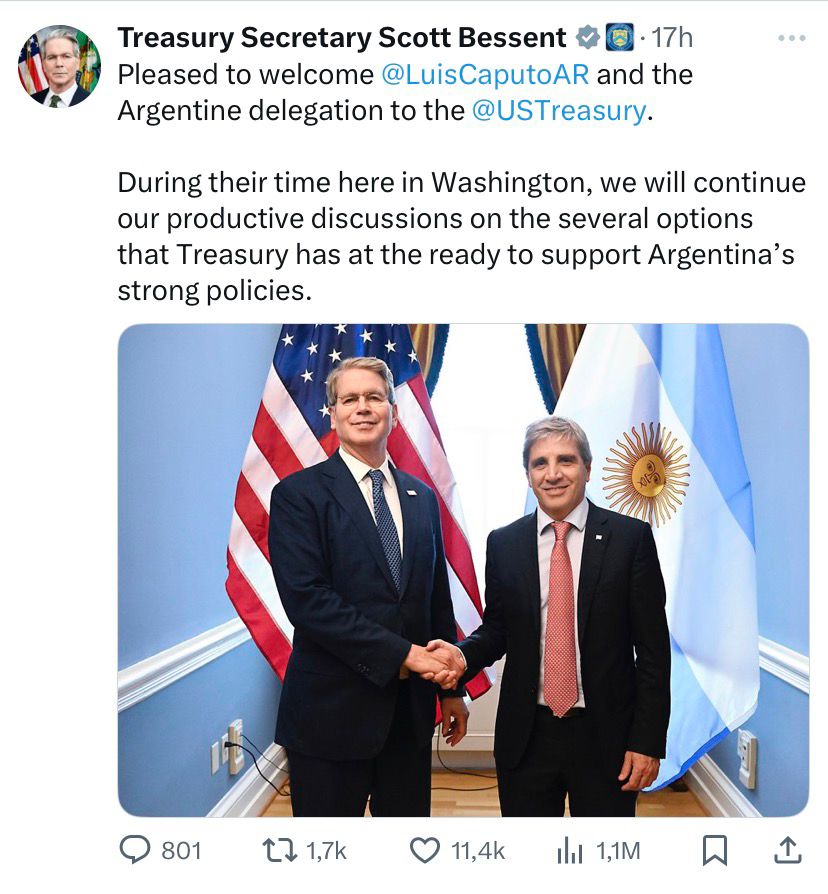 En su cuenta de la red social X, Bessent destacó la visita del titular del Palacio de Hacienda y su equipo a Washington: «Me complace dar la bienvenida Luis Caputo y a la delegación argentina al Departamento del Tesoro. Durante su estadía aquí en Washington, continuaremos nuestras productivas discusiones sobre las diversas opciones que el Tesoro tiene preparadas para apoyar las fuertes políticas de Argentina».