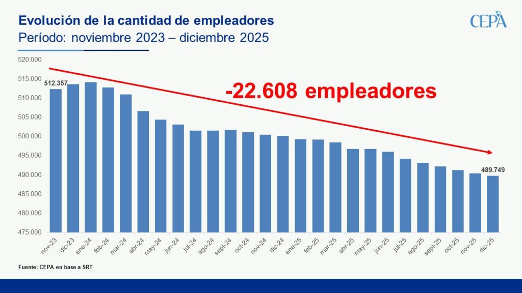 Mediante una publicación en redes sociales el Centro de Economía Política Argentina (CEPA) advirtió que bajaron sus persianas 22.608 empresas, según datos de la Superintendencia de Riesgos del Trabajo.