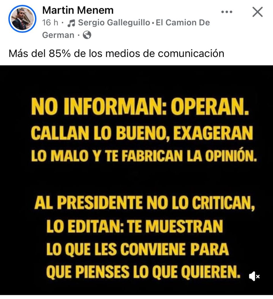 En ese marco se inscribe el posteo de Martín Menem, quien aseguró que más del 85% de los medios de comunicación no informan, sino que operan. La afirmación, más allá de su intención política, abre una pregunta incómoda: si el 85% miente, ¿dónde queda la verdad?
