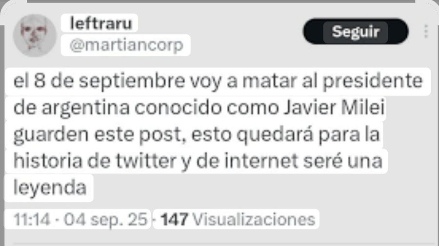 El mensaje intimidatorio, publicado por un usuario identificado como «Martiancorp», decía: «El 8 de septiembre voy a matar al presidente de Argentina conocido como Javier Milei. Guarden este post, esto quedará para la historia de Twitter y de internet. Seré una leyenda».