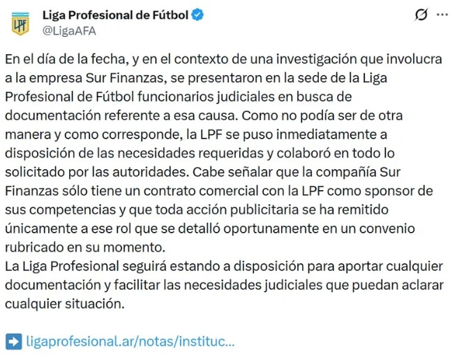 El comunicado de la Liga Profesional por la causa de lavado de dinero