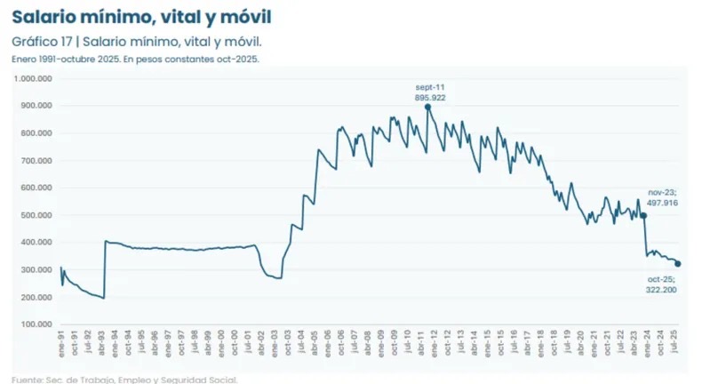 Desde noviembre de 2023, mes en que Milei llegó al poder, hasta octubre de 2025, el SMVM acumuló una pérdida real del 35%. Y el desplome no se detiene ahí: el salario mínimo vale hoy apenas un tercio de su mejor momento histórico, registrado en septiembre de 2011. Se trata de una erosión del 64% del poder de compra en poco más de una década.