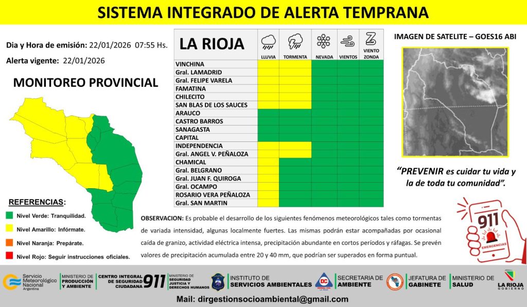 El Sistema Integrado de Alerta Temprana emitió una alerta por lluvias y tormentas en diversos departamentos de La Rioja. La alerta estará vigente hasta el viernes 22 de enero.
