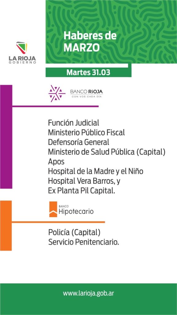 El Ministerio de Hacienda de la provincia publicó el cronograma de pago de haberes que comenzará este martes 31, adelantado por el Gobierno de La Rioja debido al feriado de Semana Santa.