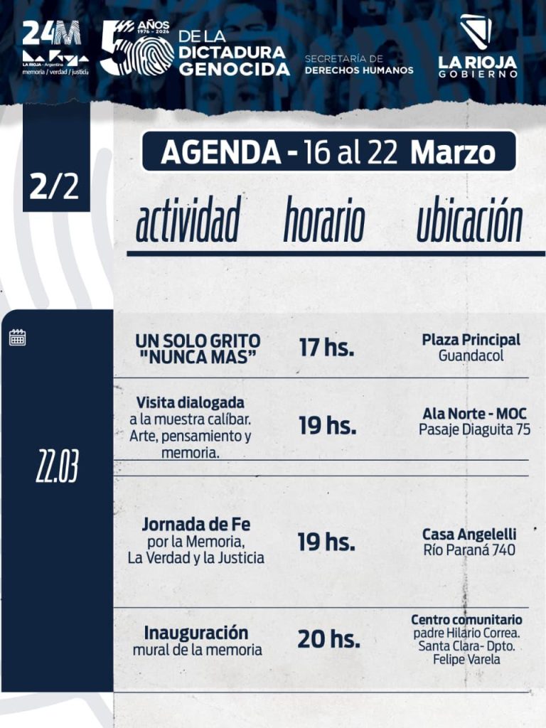 24 de marzo – Acto oficial de la Secretaría de Derechos Humanos, a las 11 horas, en la Iglesia El Salvador (UNLaR Chamical).