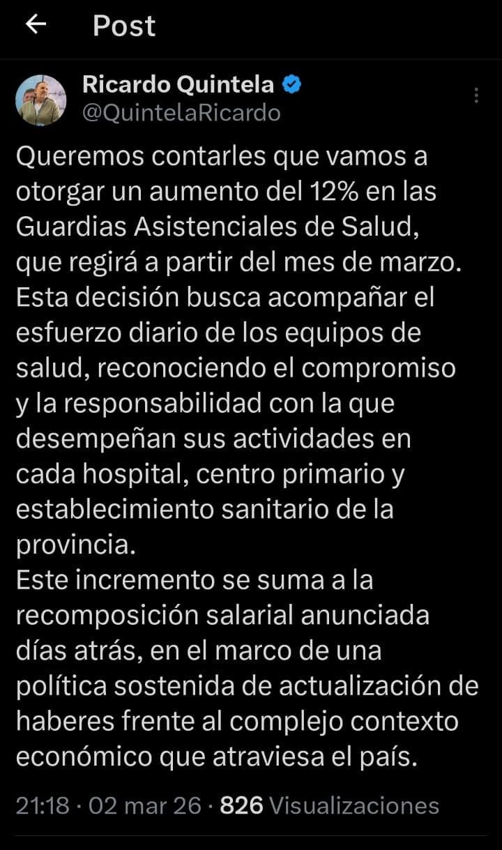 La medida forma parte de una política salarial sostenida que la Provincia viene implementando para acompañar el esfuerzo de las y los trabajadores estatales, en especial de quienes integran el sistema sanitario. El aumento busca reconocer el compromiso, la responsabilidad y la vocación de servicio con la que los equipos de salud cumplen sus tareas en hospitales, centros primarios y establecimientos sanitarios de todo el territorio provincial.