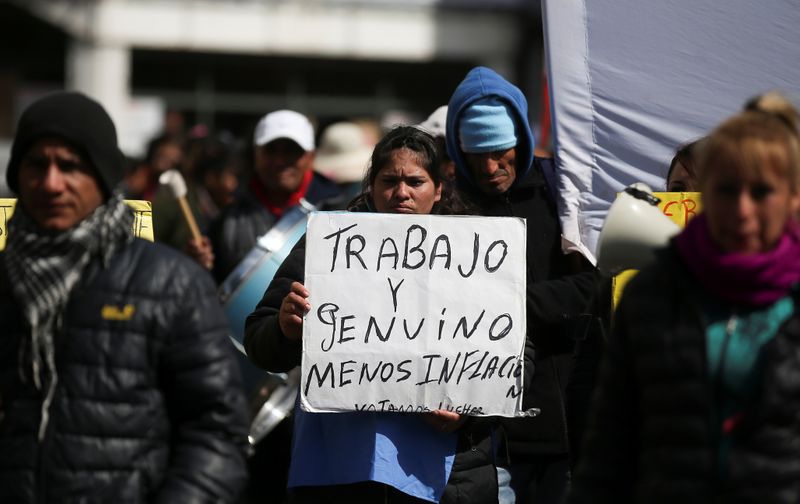 Una mujer sostiene un cartel que dice "Trabajo genuino y menos inflación" durante una protestarealizada en septiembre en Buenos Aires. Foto de archivo, 4 Sep 2019. REUTERS/Agustin Marcarian