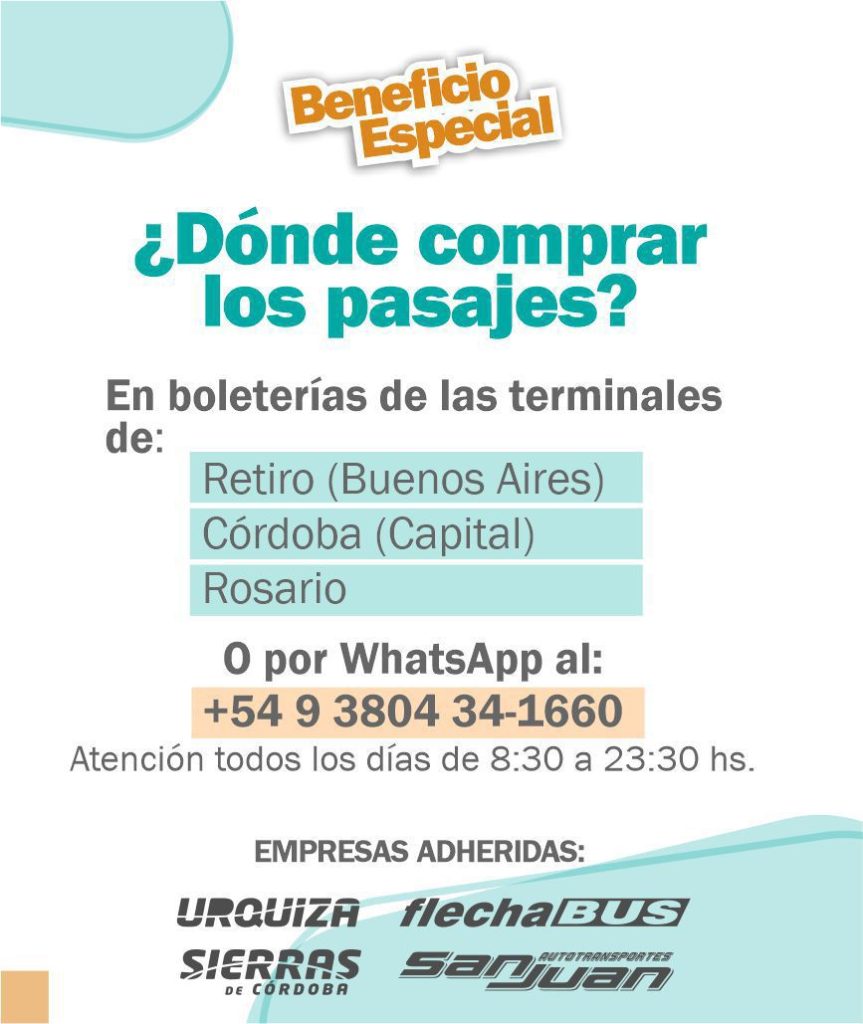 Los beneficios se aplican para pasajes ida y vuelta con destino La Rioja y fecha cerrada adquiridos a través de las empresas adheridas: Urquiza, Flecha Bus, Sierras de Córdoba y Autotransporte San Juan. La promoción es válida hasta el 27 de diciembre del 2025.