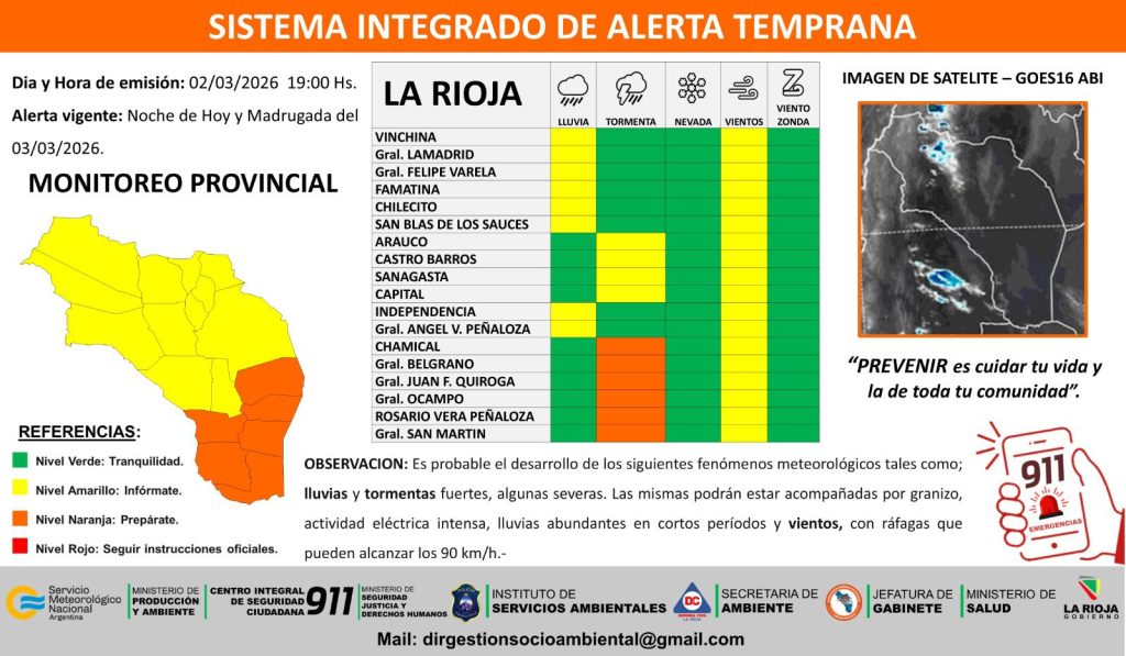 El Sistema Provincial de Emergencias La Rioja emitió un alerta naranja por la probable ocurrencia de tormentas fuertes en el sur y sureste de la provincia.