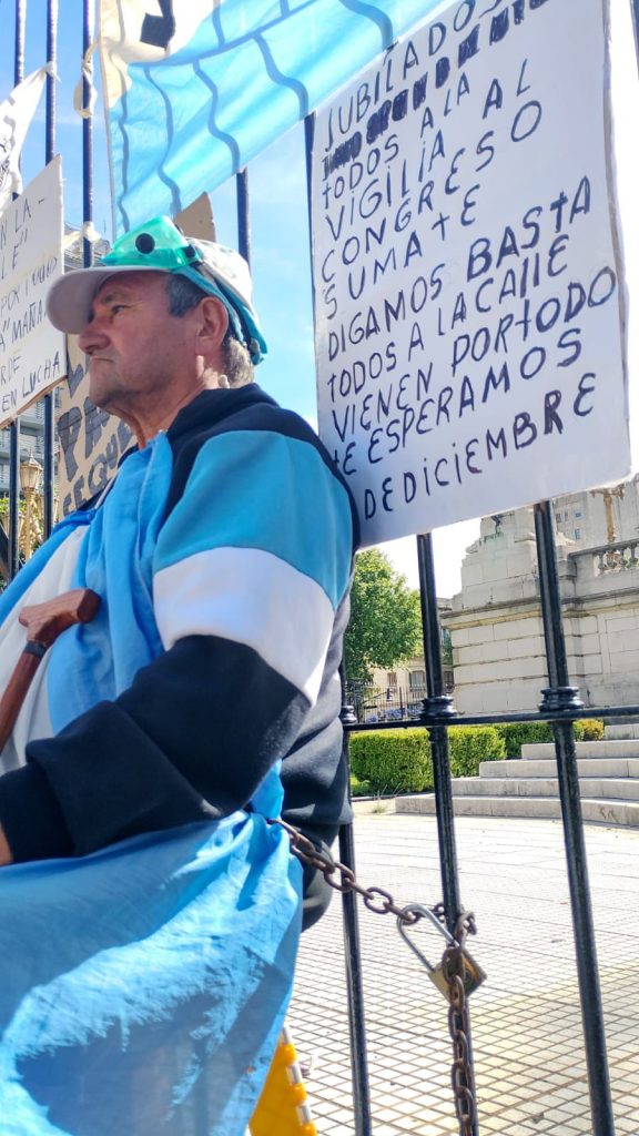 Otro de los jubilados recordó que la decisión de encadenarse no es casual: «Lo hacemos por prevención. La primera vez que vinimos, la policía nos reprimió».