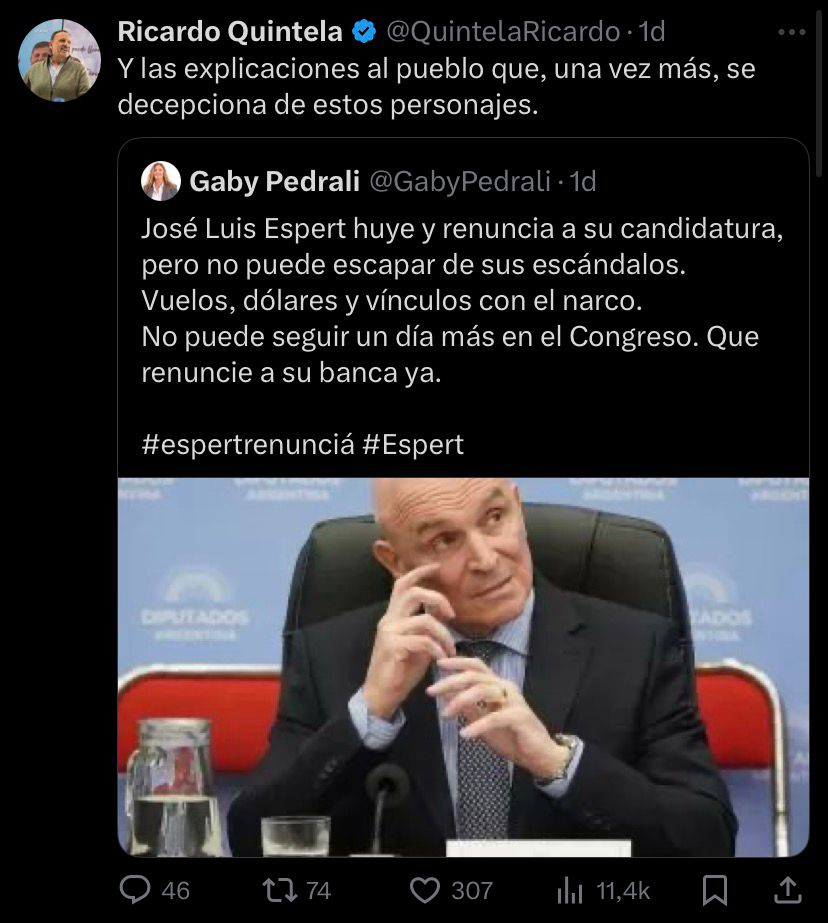 Por su parte, el gobernador Ricardo Quintela respaldó el mensaje y agregó: «Y las explicaciones al pueblo que, una vez más, se decepciona de estos personajes».
