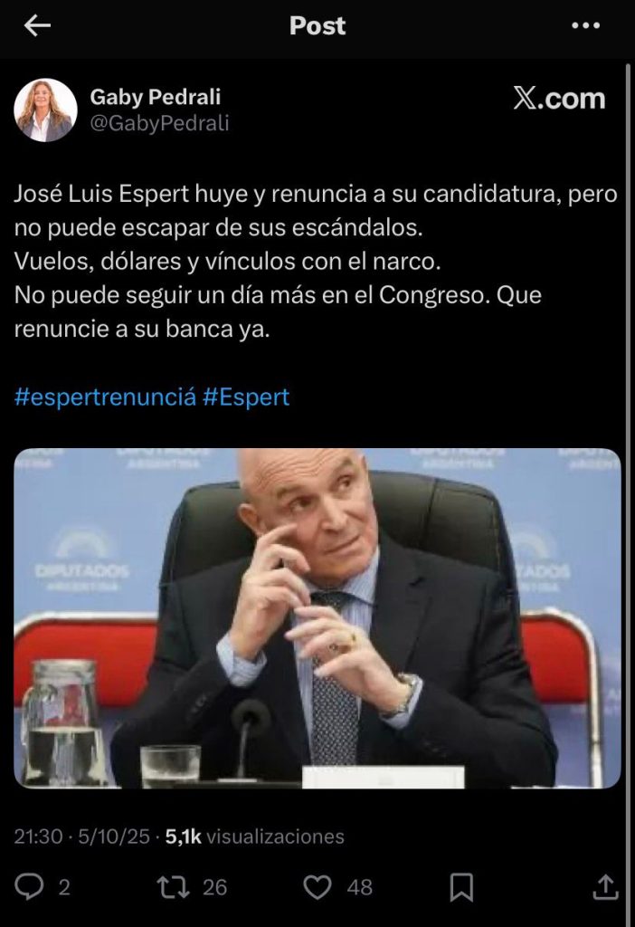 Gabriela Pedrali fue tajante: «José Luis Espert huye y renuncia a su candidatura, pero no puede escapar de sus escándalos. Vuelos, dólares y vínculos con el narco. No puede seguir un día más en el Congreso. Que renuncie a su banca ya», escribió la diputada.