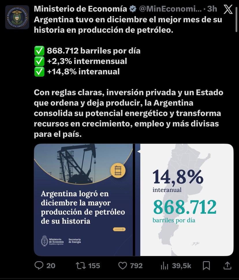 «Argentina tuvo en diciembre el mejor mes de su historia en producción de petróleo», destacó la Secretaría de Energía a través de un posteo oficial, donde atribuyó el resultado a la combinación de reglas claras, inversión privada y un Estado que «ordena y deja producir».