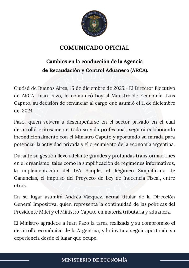 Según informó el Ministerio de Economía, Pazo deja el organismo para «volver a desempeñarse en el sector privado», una explicación que se repite como argumento habitual dentro de la administración libertaria cada vez que se produce un recambio en áreas sensibles del Estado. No obstante, el comunicado oficial evita profundizar en los resultados concretos de su gestión o en las razones políticas que motivaron su alejamiento.