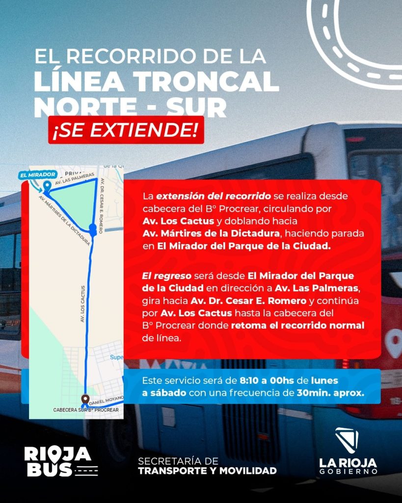 Rioja Bus, junto a la Secretaría de Transporte y Movilidad del Gobierno de La Rioja, informó la extensión del recorrido de la Línea Troncal Norte–Sur, una medida que busca mejorar la conectividad y el acceso al transporte público en sectores clave de la ciudad.