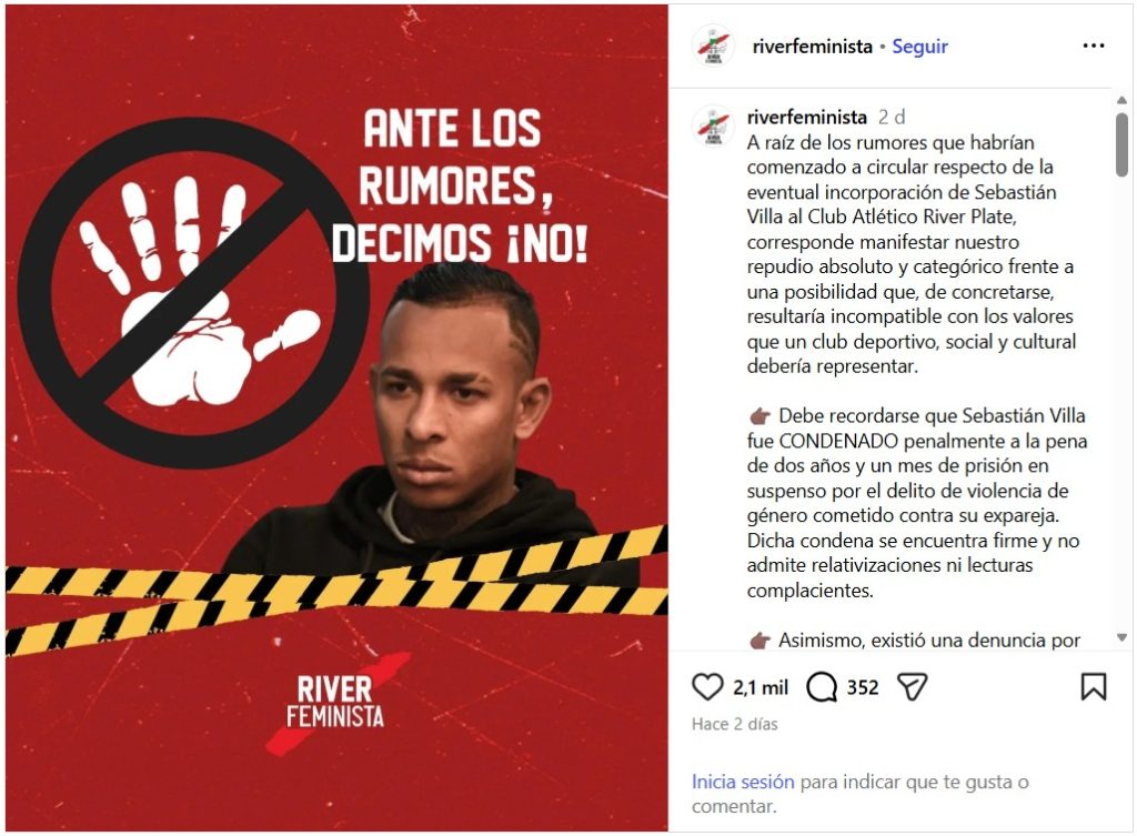 La agrupación «River Feminista» publicó este lunes un duro comunicado para frenar la llegada de Sebastián Villa al Club de Núñez durante el presente mercado de pases. El actual extremo de Independiente Rivadavia de Mendoza cuenta con una sentencia judicial de junio de 2023 por lesiones leves agravadas por el vínculo contra su ex pareja, Daniela Cortés. Ante el deseo manifiesto del futbolista de vestir la banda roja, las integrantes del colectivo exigieron coherencia con los valores institucionales y sociales de la entidad millonaria.
