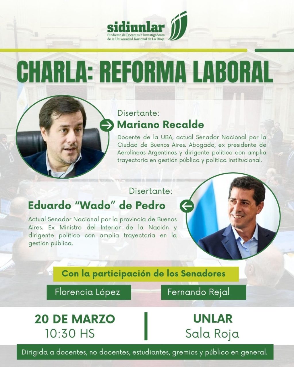 La mesa de disertantes estará encabezada por el senador nacional Mariano Recalde, abogado laboralista y docente de la UBA, y su par en la Cámara Alta, Eduardo “Wado” de Pedro. El panel se completará con la participación activa de los senadores nacionales por La Rioja, Florencia López y Fernando Rejal, quienes sumarán la perspectiva legislativa provincial al debate.