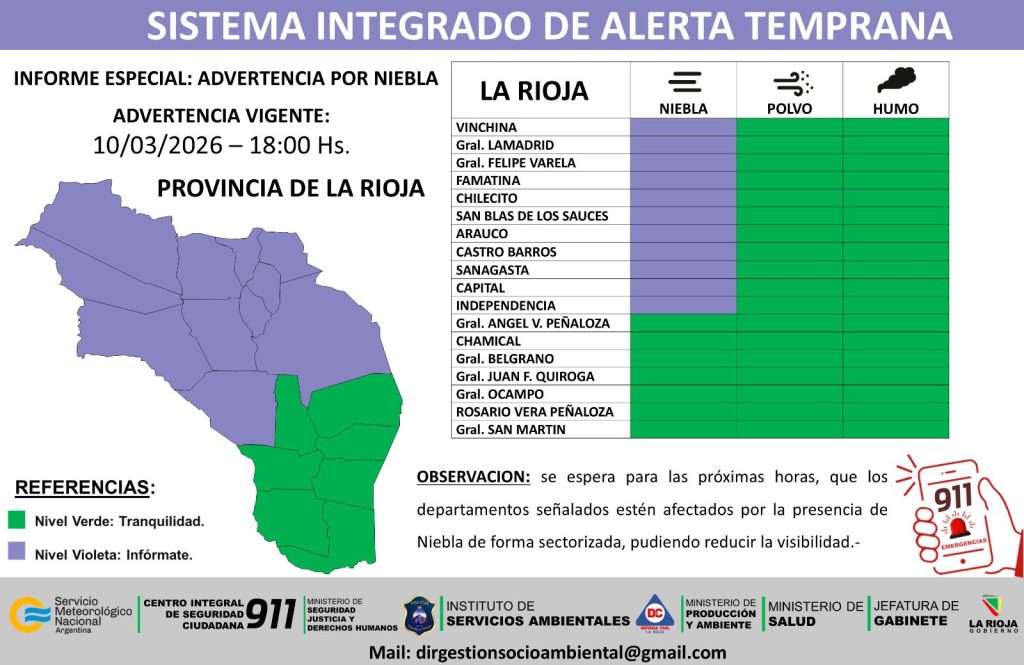 Por otro lado, el Sistema Provincial de Emergencias La Rioja emitió otro alerta por la posible presencia de niebla en gran parte del territorio provincial.