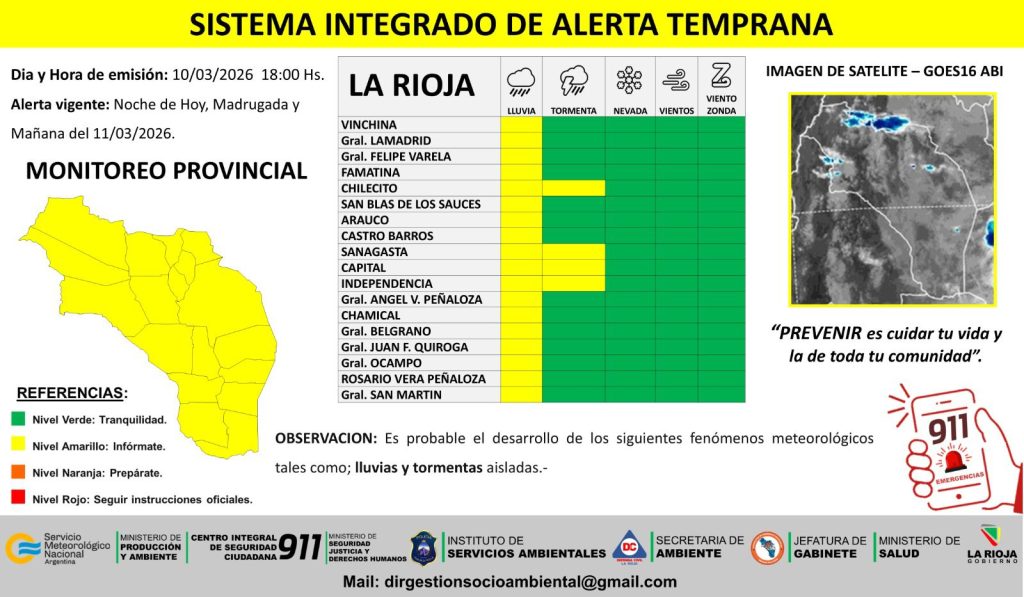 Este alerta amarilla por lluvias rige para todo el territorio provincial mientras que en el caso de tormentas el alerta está vigente para los departamentos Chilecito, Sanagasta, Capital e Independencia.