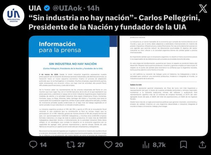 La Unión Industrial Argentina tras el discurso de Milei en el Congreso: «Sin industria no hay Nación» Información General Nacionales La Unión Industrial Argentina tras el discurso de Milei en el Congreso: «Sin industria no hay Nación»