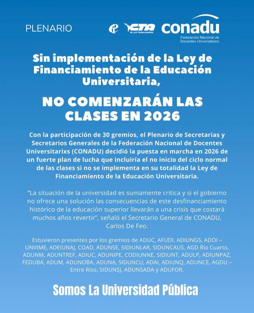 La Federación Nacional de Docentes Universitarixs (CONADU) anunció que, si el Gobierno nacional no implementa de manera plena la Ley de Financiamiento de la Educación Universitaria recientemente aprobada por el Congreso, no comenzarán las clases en 2026. La decisión fue tomada por el Plenario de Secretarias y Secretarios Generales, que reunió a representantes de 30 gremios de todo el país.