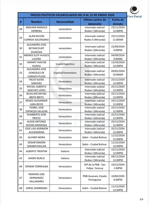 Foro Penal publicó la lista de los presos políticos que fueron excarcelados desde el 8 al 12 de enero, y allí se encuentra Harari: